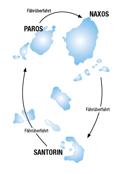 Ausgangspunkte: Neben der griechischen Hauptstadt Athen eignen sich vor allem Santorin, Paros, Naxos oder Mykonos gut als Ausgangspunkte der griechischen Inselkombination.